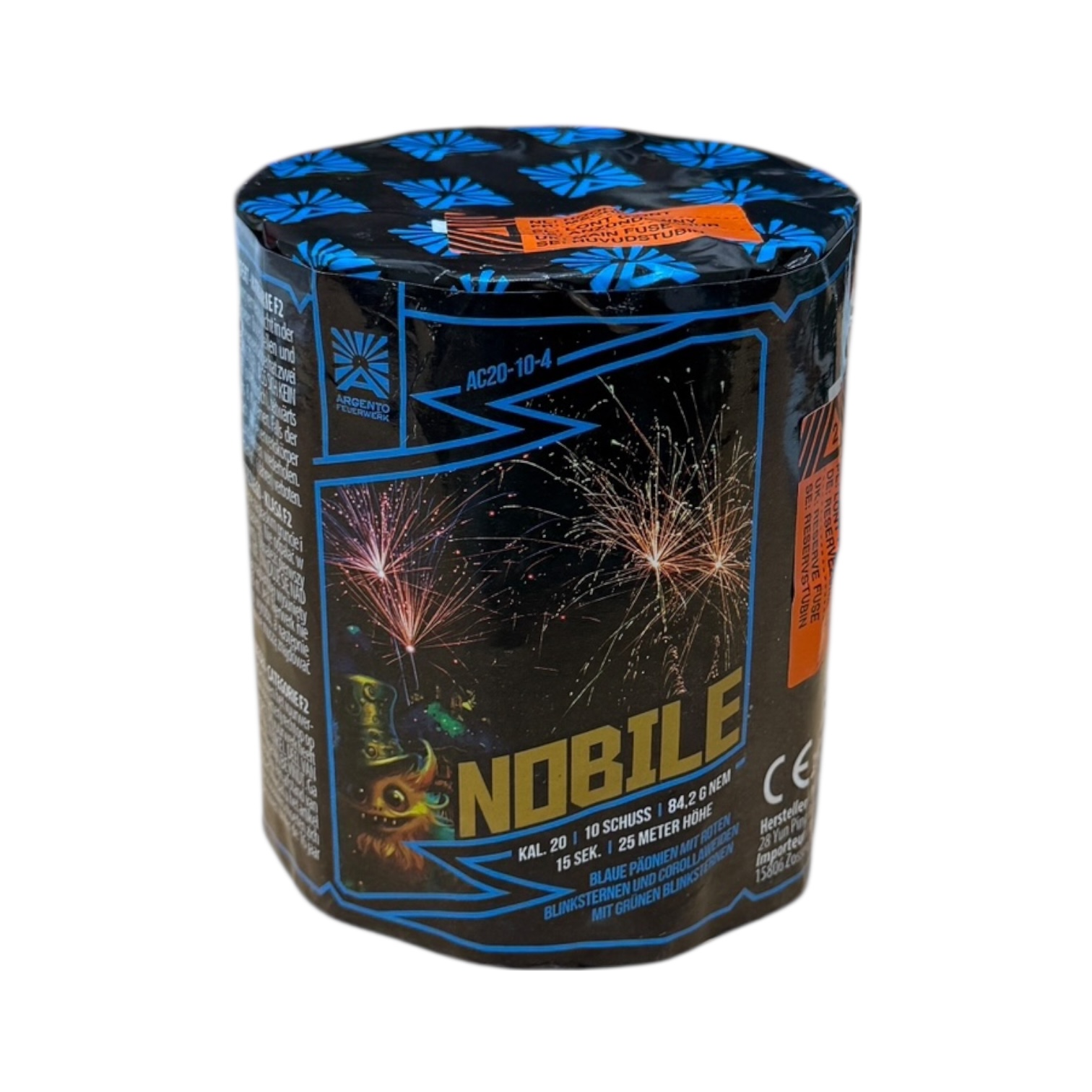 The Nobile AC20-10-4 from Argento Fireworks is a compact but powerful 10-shot 20 mm aerial cake that showcases the refined style of Argento’s F2 series.
